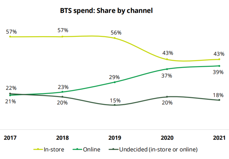 调查显示,目前偏好通过网购采买开学物品的趋势仍在上升,达到39%,与占比43%的店内购买偏好逐渐趋近。